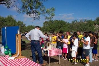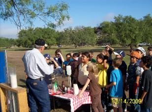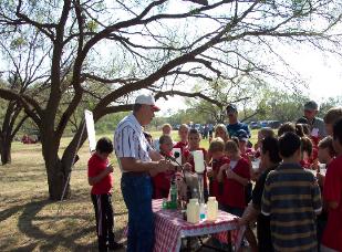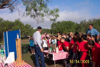 CONCHO AND RUNNELS COUNTY FIELD DAYS Allan shows the geologic formation in an aquifer, how pollution can get in underground water, and how pumping can cause a decline in the water table by demonstrating an edible aquifer. |
